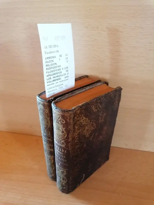 ALMEIDA, Teodoro de ARMONIA DE LA RAZON Y LA RELIGION, O RESPUESTAS FILOSOFICAS A LOS ARGUMENTOS DE LOS INCREDULOS (2 VOLUMENES) obra escrita en portugues por el P. — … trad por el P. Francisco VAZQUEZ. Libreria Religiosa. Barcelona 1850 2 vols. (14,5 cm) Enc. plena piel con guardas al agua. -5KG Sello ant. prop. N1 (Ref.49149) religion teologia filosofia razon