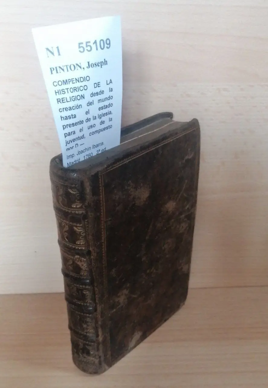 PINTON, Joseph COMPENDIO HISTORICO DE LA RELIGION desde la creación del mundo hasta el estado presente de la Iglesia, para el uso de la juventud, compuesto por D. —, Imp. Joachin Ibarra. Madrid 1760 3ª ed. 13h+ 362 p. (15,5 cm) Bonita encuadernación en plena piel con nervios y dorados. Cortes dorados. Guardas artesanas. -2KG Anotaciones manuscritas y firmas de anterior propietario en página de cortesía. N1 (Ref.55109) religion espiritualidad catecismo historia educacion