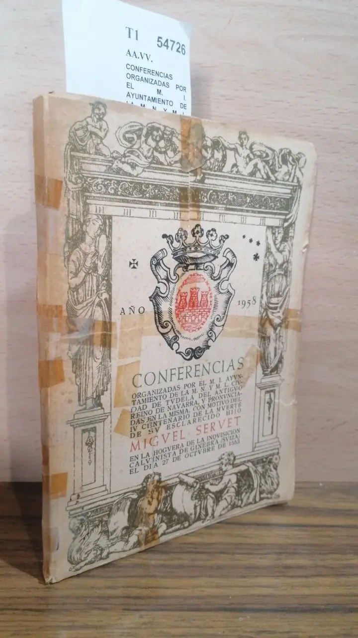 AA.VV. CONFERENCIAS ORGANIZADAS POR EL M. I. AYUNTAMIENTO DE LA M. N. Y M. L. CIUDAD DE TUDELA DEL ANTIGUO REINO DE NAVARRA, Y PRONUNCIADAS EN LA MISMA, CON MOTIVO DEL IV CENTENARIO DE LA MUERTE DE SU ESCLARECIDO HIJO MIGUEL SERVET EN LA HOGUERA DE LA INQUISICION CALVINISTA DE GINEBRA (SUIZA) EL DIA 27 DE OCTUBRE DE 1553. Ayuntamiento de Tudela 1958 sin numeracion (22 cm.) Enc. rustica. -5KG Fotos bn Deslucido. Cubiertas rasgadas y reparadas con celofan autoadesivo. Folleto I T1 (Ref.54726) inquisicion miguel servet