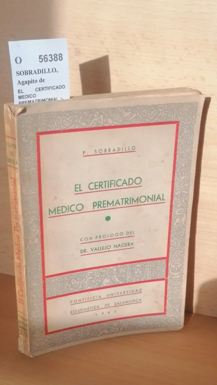 SOBRADILLO, Agapito de EL CERTIFICADO MEDICO PREMATRIMONIAL Universidad Pontificia de Salamanca 1943 171 p. (21 cm.) Enc. rustica. -2KG Puntos de óxido Prólogo del dr. Vallejo Nagera O (Ref.56388) medicina prematrimonial