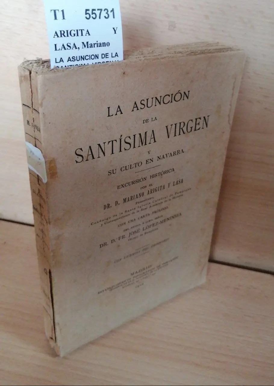 ARIGITA Y LASA, Mariano LA ASUNCION DE LA SANTISIMA VIRGEN Y SU CULTO EN NAVARRA. EXCURSION HISTORICA POR EL DR. D. —, PRESBITERO, Canónigo de la Santa Iglesia Catedral de Pamplona y Correspondiente de la Real Academia de la Historia. CON UNA CARTA – PROLOGO del Excmo. e Ilmo. Señor Dr. D. Fr. Jose LOPEZ – MENDOZA, Obispo de Pamplona. Fortanet. Madrid. 1910 245 p. (19 cm) Rustica. -5KG T1 (Ref.55731) navarra historia iglesia religion mariologia pamplona