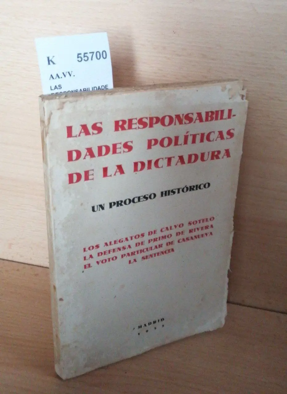 AA.VV. LAS RESPONSABILIDADES POLITICAS DE LA DICTADURA. Un proceso historico. Saez. Madrid 1933 133 p. (19 cm) Enc. rustica. -2KG Los alegatos de Calvo Sotelo. La defensa de Primo de Rivera. El voto particular de Casanueva. La sentencia. K (Ref.55700) historia politica segunda republica española dictadura ensayo
