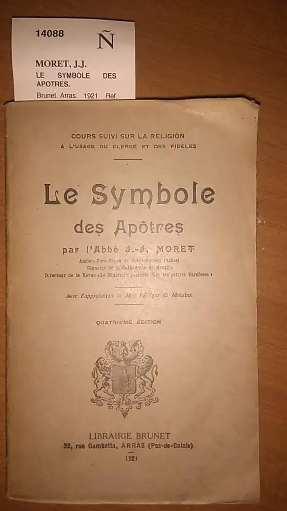 MORET, J.J. LE SYMBOLE DES APOTRES. Brunet. Arras. 1921 264 p. (19 cm) Rustica. -5KG Sello ant. prop. / Intonso. N1 (Ref.14088) religion espiritualidad catecismo fe frances OFERTA20