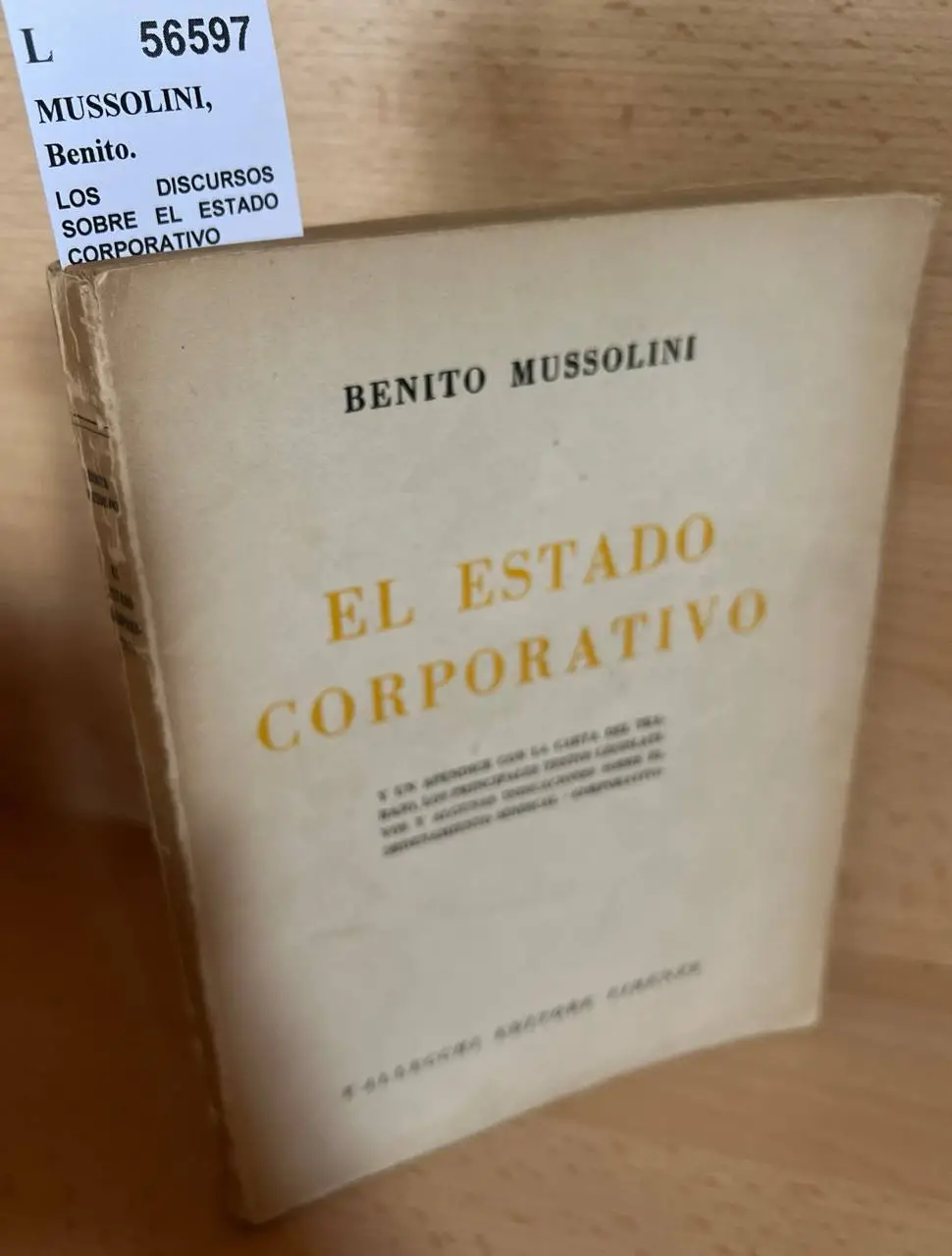 MUSSOLINI, Benito. LOS DISCURSOS SOBRE EL ESTADO CORPORATIVO Vallecchi. Firenze 1936 142 p. (22 cm) Enc. rustica. -2KG Sello de anterior propietario Y un apendice con la carta del trabajo, los principales textos legislativos y algunas indicaciones sobre el ordenamiento sindical-corporativo L (Ref.56597) ensayo fascismo italia corporativismo socialismo sindicalismo