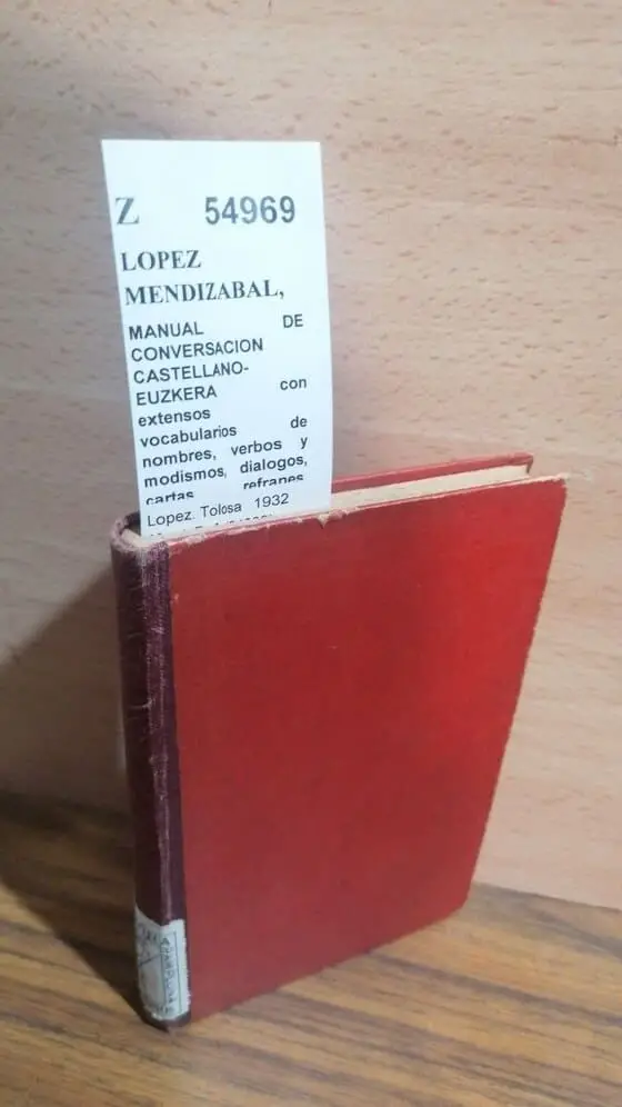 LOPEZ MENDIZABAL, Isaac MANUAL DE CONVERSACION CASTELLANO-EUZKERA con extensos vocabularios de nombres, verbos y modismos, dialogos, cartas, refranes, anuncios y un compendio de gramatica por — / ERDEL-EUZKEL-ALKARIZKETAKO IDAZTITXOA… izen, aditz eta esakeren iztegiak, alkarizketak, idazkiak, esaera zarrak, iragarkiak, eta euzkel-iztitxoa — egiña. Lopez. Tolosa 1932 3ª ed. 371 p. (16 cm) Enc. tela color rojo muda. -5KG Restaurado. Entero y bien encuadernado, aunque con portada fotocopiada. Z (Ref.54969) euskera vascuence idiomas gramatica