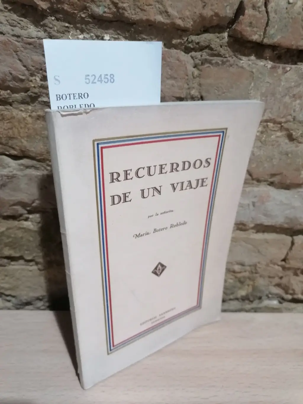 BOTERO ROBLEDO, Maria RECUERDOS DE UN VIAJE por la señorita —. Aramburu. Pamplona 1929 99 p. (19,5 cm) Enc. rustica. -5KG Retrato color de la autora. Algunas fotogr. bn. Descripción de un viaje a través de Colombia por la autora, natural de Manizales. S (Ref.52458) viajes colombia mujer america