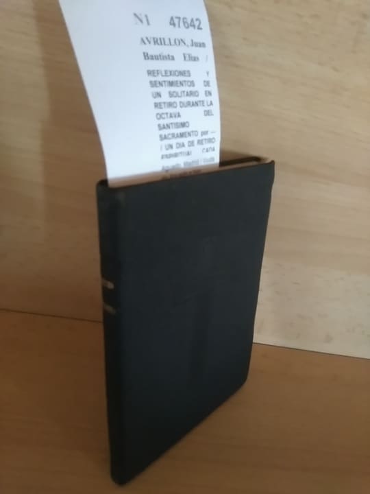 AVRILLON, Juan Bautista Elias / SANTIAGO, Felipe REFLEXIONES Y SENTIMIENTOS DE UN SOLITARIO EN RETIRO DURANTE LA OCTAVA DEL SANTISIMO SACRAMENTO por — / UN DIA DE RETIRO ESPIRITUAL CADA MES, por Don — Aguado. Madrid / Viuda de Aguado e hijo. Madrid 1851 2 tomos en un vol. con: 112+ 80 p. (14,5 cm) Enc. tela negra -2KG Sello ant. prop. 2 tomos encuadernados juntos en un volumen facticio. Años 1851 y 1875. N1 (Ref.47642) religion espiritualidad