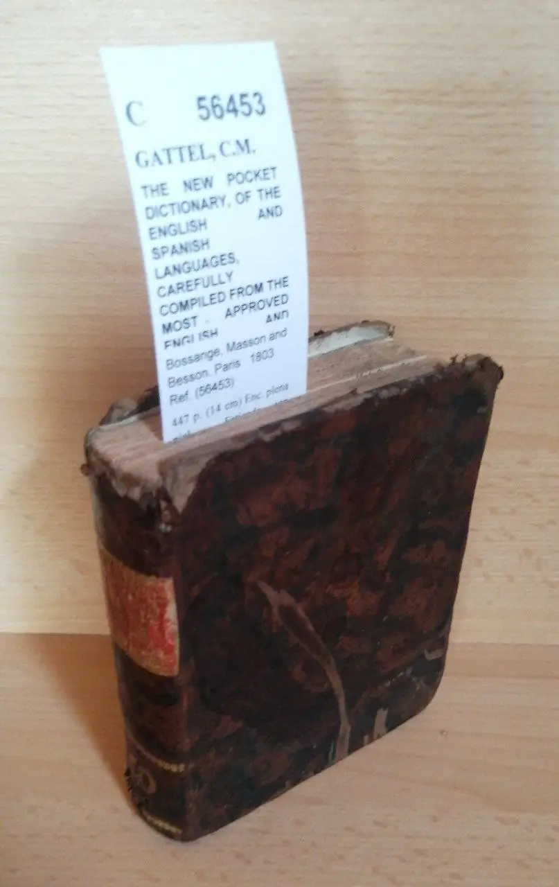 GATTEL, C.M. THE NEW POCKET DICTIONARY, OF THE ENGLISH AND SPANISH LANGUAGES, CAREFULLY COMPILED FROM THE MOST APPROVED ENGLISH AND SPANISH DICTIONARIES. BY — English and Spanish. Bossange, Masson and Besson. Paris 1803 447 p. (14 cm) Enc. plena piel. -5KG Fatigado, con desperfectos en parte superior del lomo, marcas de insectos, corto de márgenes… ¿Y si fuera este mismo el diccionario que llevaba Mambrú en el bolsillo de su casaca? Este volumen es la PART II. (The English before the Spanish). C (Ref.56453) inglés historia diccionario idiomas