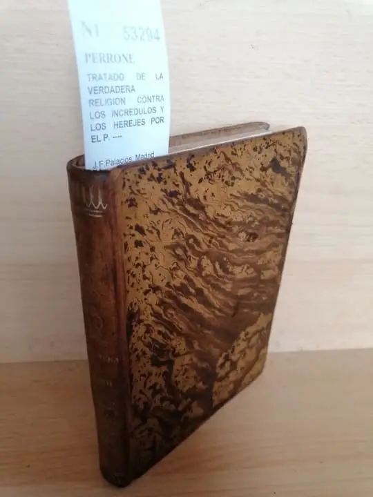 PERRONE TRATADO DE LA VERDADERA RELIGION CONTRA LOS INCREDULOS Y LOS HEREJES POR EL P. —- J.F.Palacios. Madrid 1844 358 p. (18 cm.) Enc. plena piel con dorados, guardas al agua -5KG sello ant. prop Biblioteca Religiosa: por Una Sociedad de Literatos. Tomo 19 N1 (Ref.53294) religion teologia herejia
